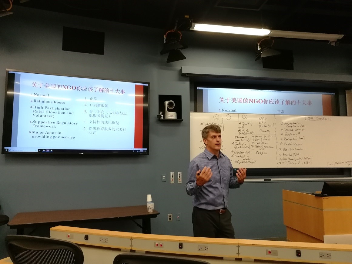 第一节课的主题是非政府组织,由马克斯韦尔公民与公共事务管理学院高级公共管理教育主任Steve Lux老师讲解。Steve老师从定义、十项信息、法律框架等角度带领同学们了解美国的非政府组织。在美国,民众对非政府组织的信任度高达70%,远远高于公众对总统和议会的信任程度。其非政府组织数量庞大,公众参与度高,资金投入量大,注册流程严谨,环境支持充分,已形成成熟的体系。在课程最后的讨论环节,同学们提出了九个问题,老师耐心地为同学们逐一解答。体会感悟:美国的NGO独立性是很强的,也比中国发展得更早更成熟,Steve教授还提到了中国红十字会的“郭美美事件”,让我深有感触,我向Steve教授提的问题是:How to deal with corruption in the NGO?他用网上各种NGO必须公示的资金来源、管理人员薪资以及腐败的惩罚法制等事实告诉我,阳光透明是预防腐败最有效的方式,而法制是反腐最好的保障机制之一。
