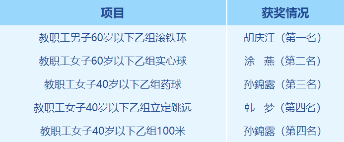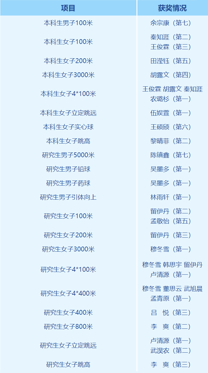 经过激烈的角逐,我院获得优秀组织奖、道德风尚奖、本科生乙组团体总分第六名、研究生乙组团体总分第四名、广播操评比三等奖。