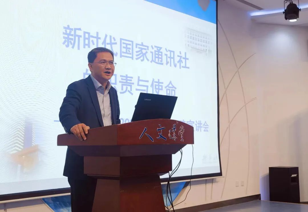 蔡劲松致辞,欢迎新华社的领导嘉宾作客北航人文讲堂。他向同学们介绍了今天讲堂的嘉宾和主要内容,特别介绍了院友胡喆的职业成长经历。他希望通过新华社各位嘉宾的讲述,能够让同学们进一步增进对中央主流媒体,特别是国家通讯社职责使命的认识和理解,进一步加深对新时代新征程上主流媒体传播能力提升和相关学科建设的思考。
