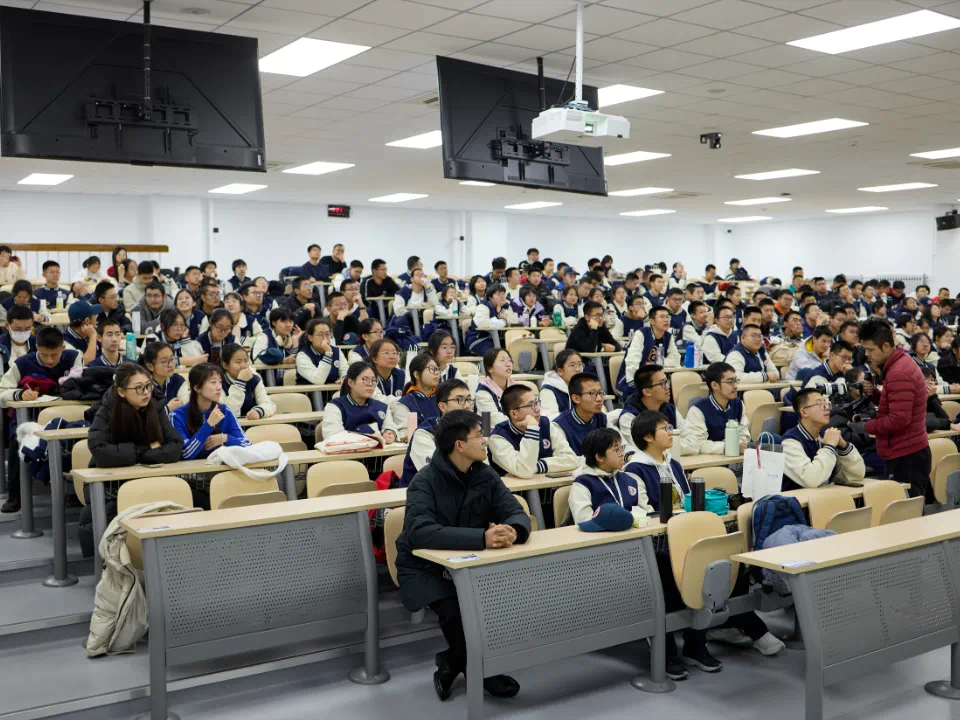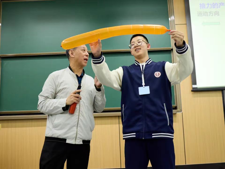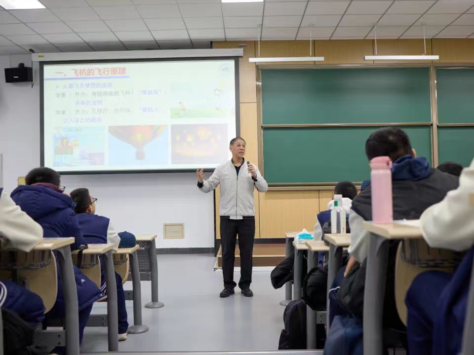 之后,教育部关工委“五老”报告团首批专家、中国科学院老科学家科普讲演团成员、北航航空发动机研究院陈志英教授为师生作《蕴含科学定律的飞行器设计》的精彩报告。陈教授凭借深厚的学术造诣和丰富的科普经验,以生动有趣的方式,深入浅出地讲解了航空航天的基础原理和发展历程。从飞机的飞行奥秘到火箭的发射原理,一个个复杂的科学概念在陈教授的阐释下变得鲜活起来,同学们聚精会神地倾听,不时发出阵阵惊叹,并与陈教授热情互动。学习了知识的同时,同学们对北航的向往也更强烈了。