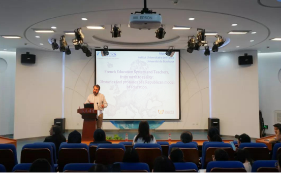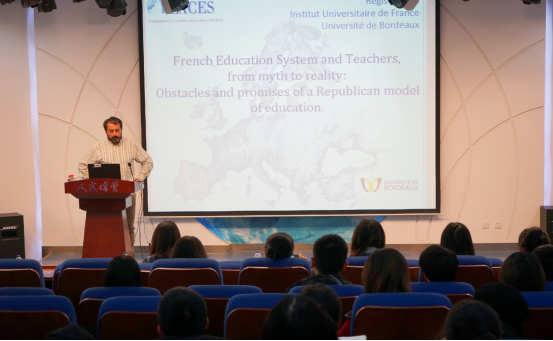 2019年10月29日下午2:00,“北航人文讲堂”学术前沿系列讲座在北航人文社会科学学院人文讲堂内举行。本次讲座邀请了波尔多大学教育学院教授Régis Malet做题为“法国教育体系与教师发展”的学术前沿讲座。讲座吸引了众多师生前来倾听。本次讲座由人文社会科学学院(公共管理学院)高等教育研究院雷庆教授主持。