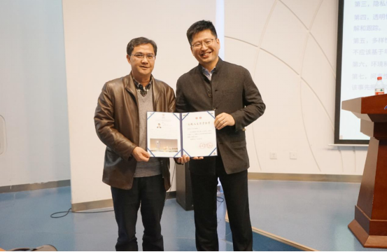 讲座最后,人文社会科学学院(公共管理学院)蔡劲松院长代表学院向于文轩教授颁发“人文讲堂”纪念证书并合影留念。