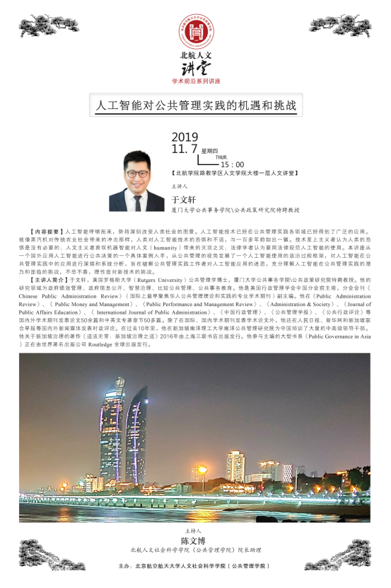 2019年11月7日下午3:00,“北航人文讲堂”学术前沿系列讲座在北航人文社会科学学院人文讲堂内进行。本次讲座邀请了厦门大学公共事务学院、公共政策研究院于文轩教授做题为“人工智能给公共管理实践带来的机遇和挑战”的学术前沿讲座,吸引了众多师生前来聆听。讲座由人文社会科学学院(公共管理学院)院长助理陈文博老师主持。