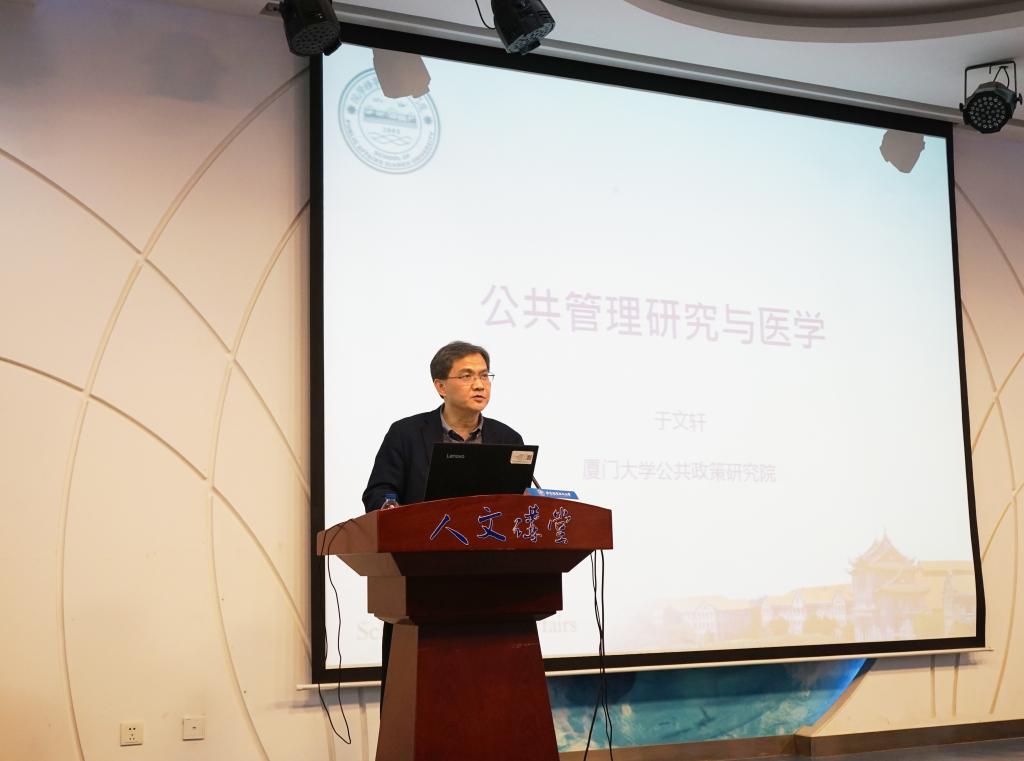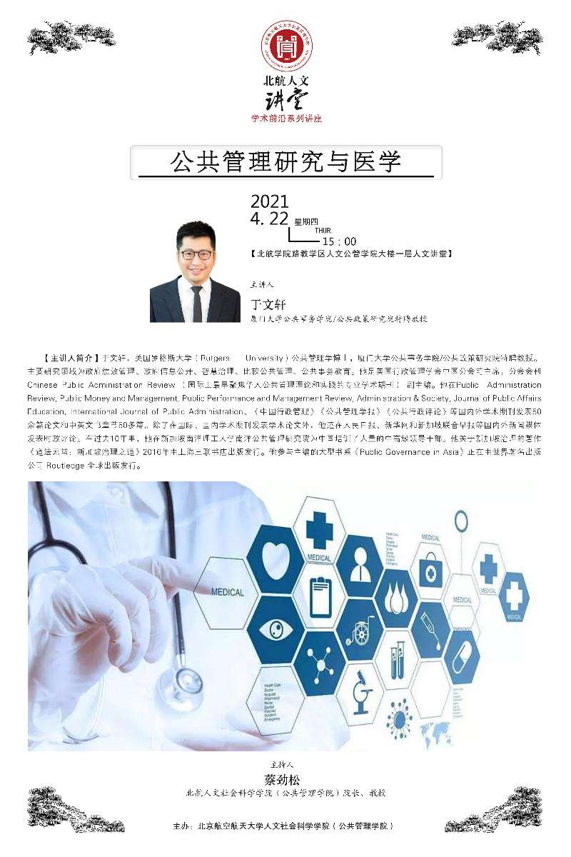 4月22日,北航“人文讲堂”学术前沿系列讲座在人文社会科学学院(公共管理学院)人文讲堂举行。本次讲座邀请了美国罗格斯大学(Rutgers University)公共管理学博士,厦门大学公共事务学院/公共政策研究院特聘教授于文轩作题为“公共管理研究与医学”的学术前沿讲座。讲座由人文社会科学学院(公共管理学院)院长蔡劲松教授主持。