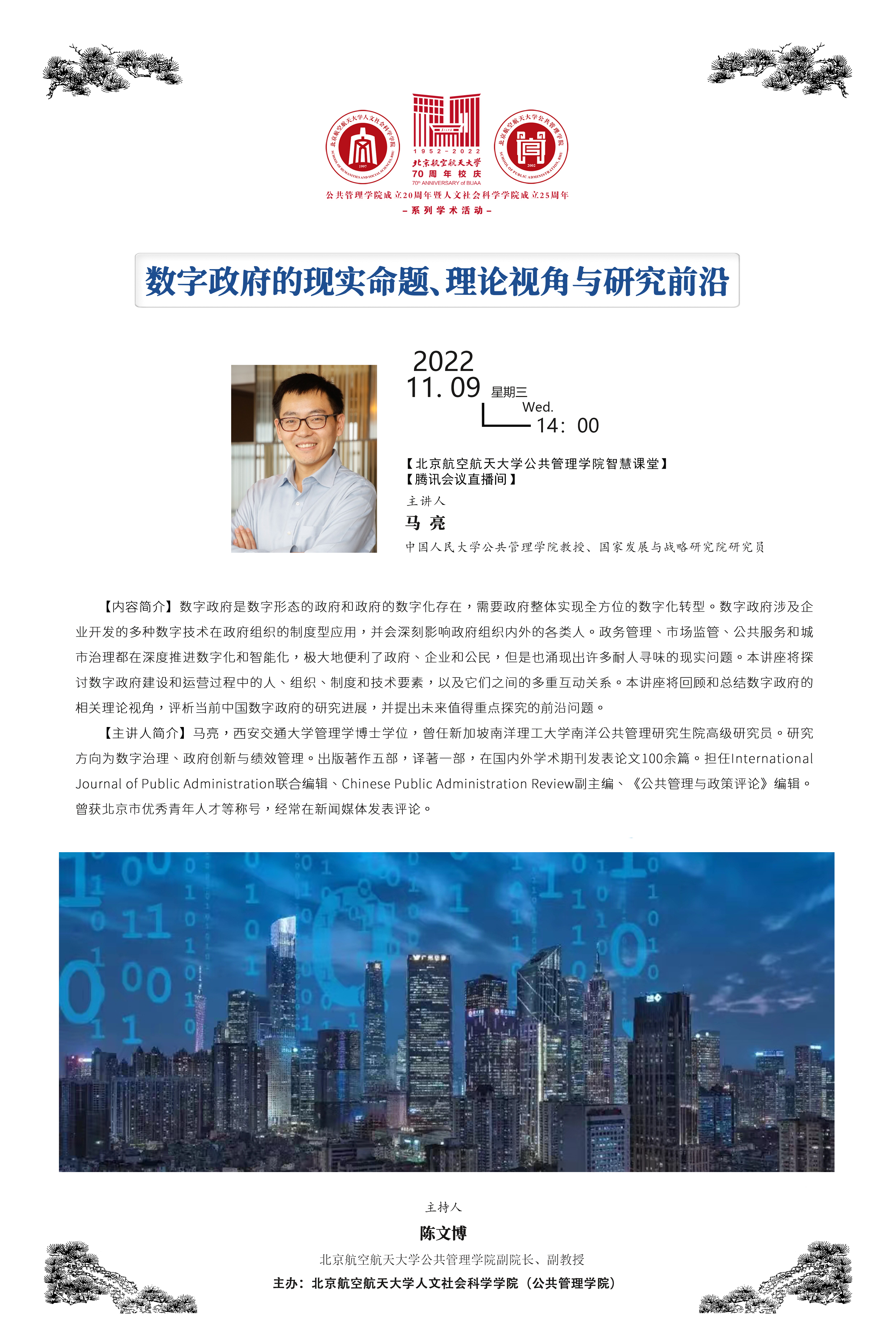 11月9日,北京欧美大片ppt免费大全公共管理学院成立20周年暨人文社会科学学院成立25周年系列学术前沿讲座在学院智慧课堂举行。本次活动邀请中国人民大学公共管理学院教授、国家发展与战略研究院研究员马亮作题为“数字政府的现实命题、理论视角与研究前沿”的学术前沿讲座。讲座由人文社会科学学院(公共管理学院)副院长陈文博主持。