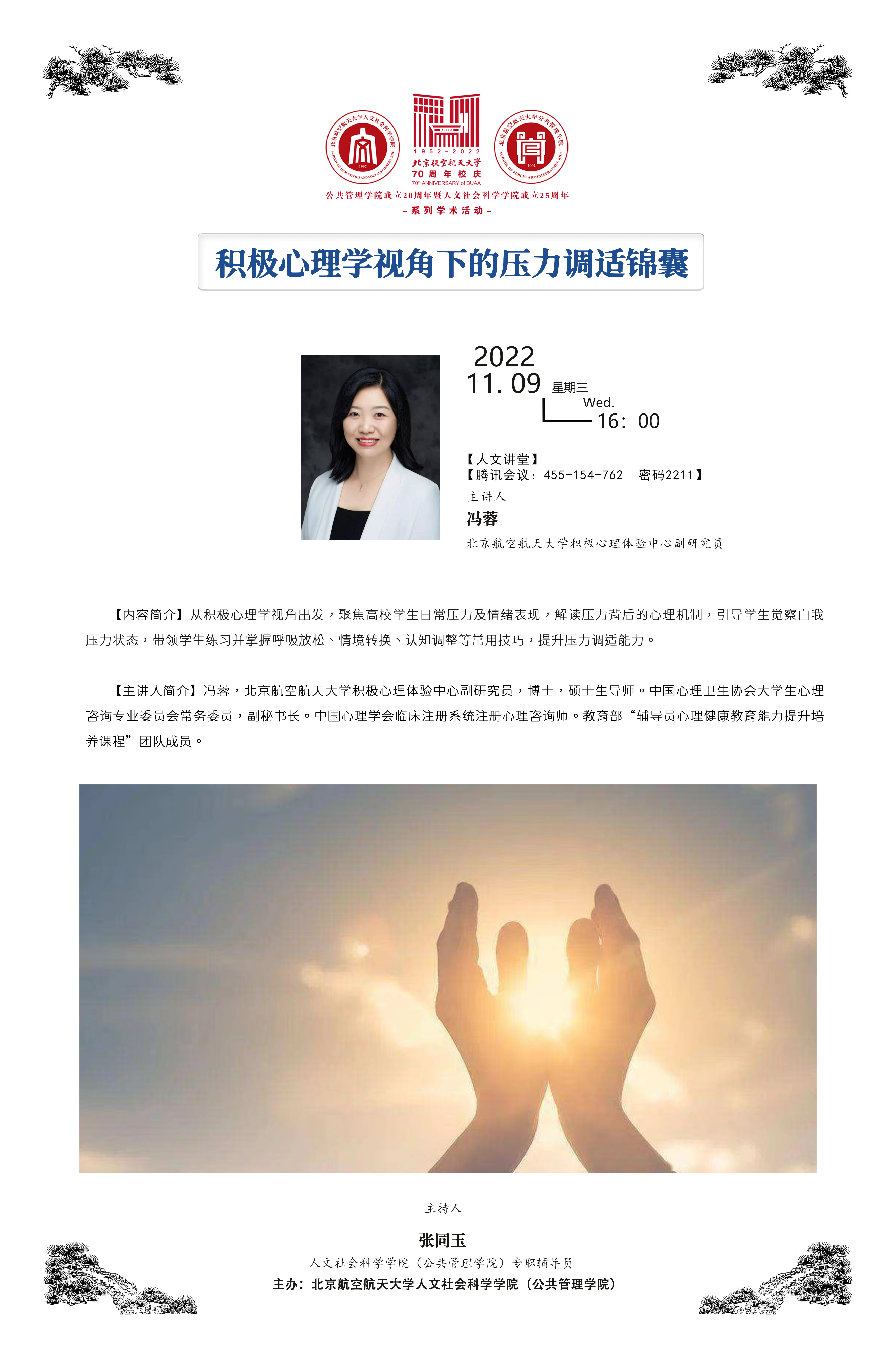 11月9日下午,北京欧美大片ppt免费大全公共管理学院成立20周年暨人文社会科学学院成立25周年系列学术前沿讲座在学院举办。本次活动邀请学校积极心理体验中心冯蓉老师作题为“积极心理学视角下的压力调适锦囊”的学术前沿讲座。讲座由人文社会科学学院(公共管理学院)专职辅导员张同玉老师主持,300余名院内外师生线上线下同步参会并交流。