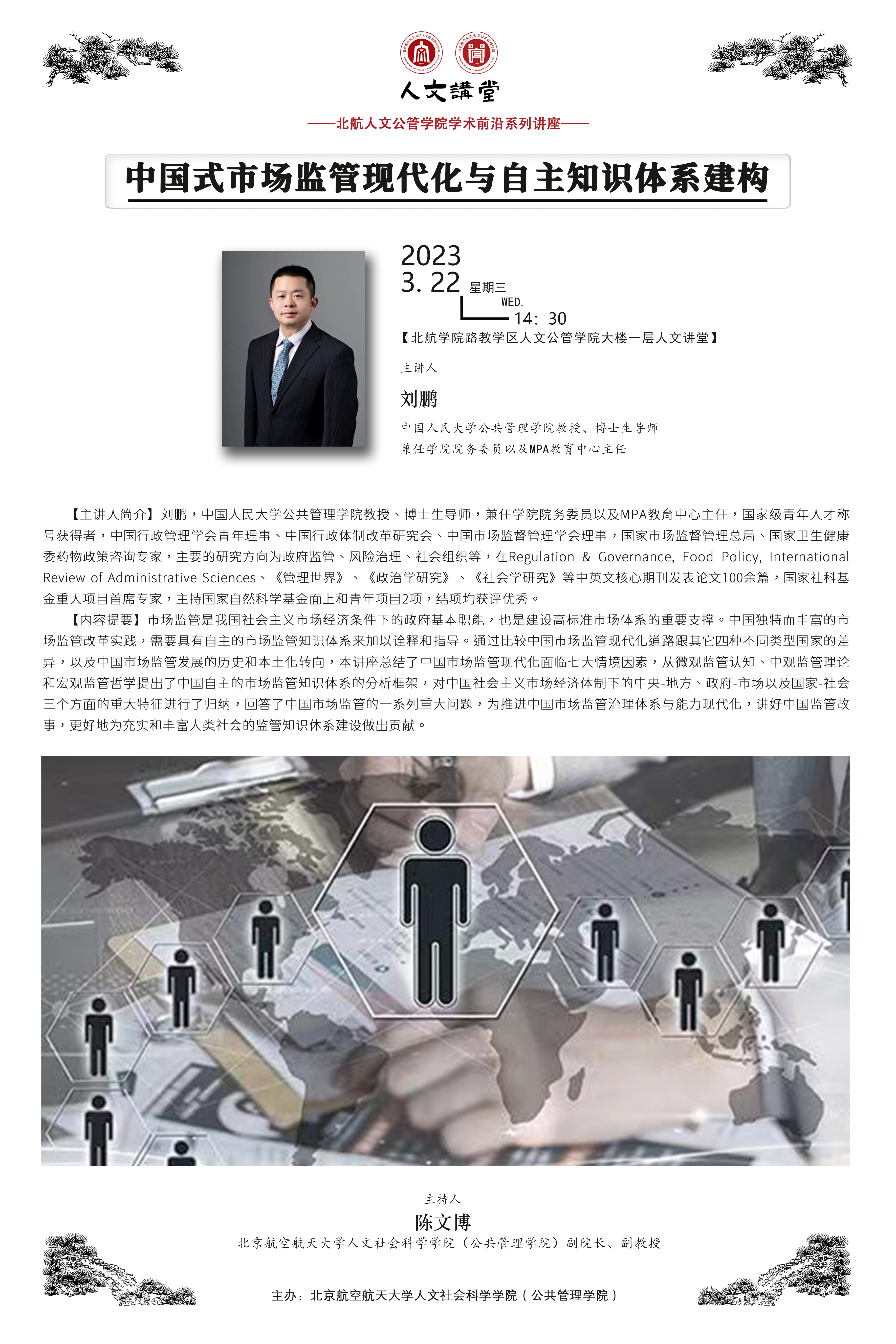 3月22日,“人文讲堂”学术前沿系列讲座在学院举办。本次讲座邀请中国人民大学公共管理学院教授刘鹏作题为“中国式市场监管现代化与自主知识体系建构”的学术前沿讲座。学院院长蔡劲松,副院长詹承豫、陈文博,教师代表任丙强、李亚、涂晓芳、王军霞、黄文、吴培熠以及学院硕博研究生参会交流。
