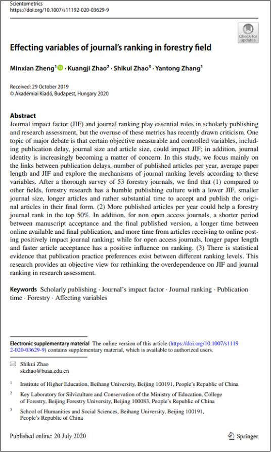 我院博士生郑敏贤、张彦通教授、赵世奎教授等在SCI/SSCI期刊 Scientometrics 合作发表题为 Effecting variables of journal’s ranking in Forestry field 的学术论文。