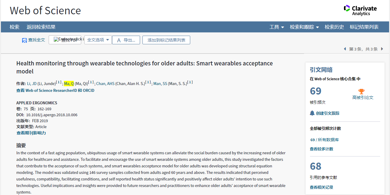 近日,我院青年教师马琪副教授与其合作者在SSCI权威期刊《Applied Ergonomics》2019年2月刊上合作发表的题为Health Monitoring through Wearable Technologies for Older Adults: Smart Wearables Acceptance Model(《老年群体可穿戴智慧健康监测设备的技术接受模型》)的论文被评为ESI高被引论文。根据对应领域和出版年中的高引用阈值,以及到2021年为止该论文的被引用次数,归入相关学术领域同一出版年最优秀的前1%之列(数据来自 Essential Science Indicators)。