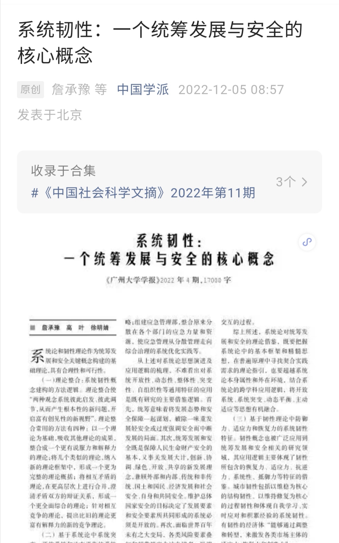 我院詹承豫教授和高叶、徐明婧研究生发表的文章“系统韧性:一个统筹发展与安全的核心概念”,被《中国社会科学文摘》2022年第11期转载,原文发表于《广州大学学报(社会科学版)》2022年第4期。