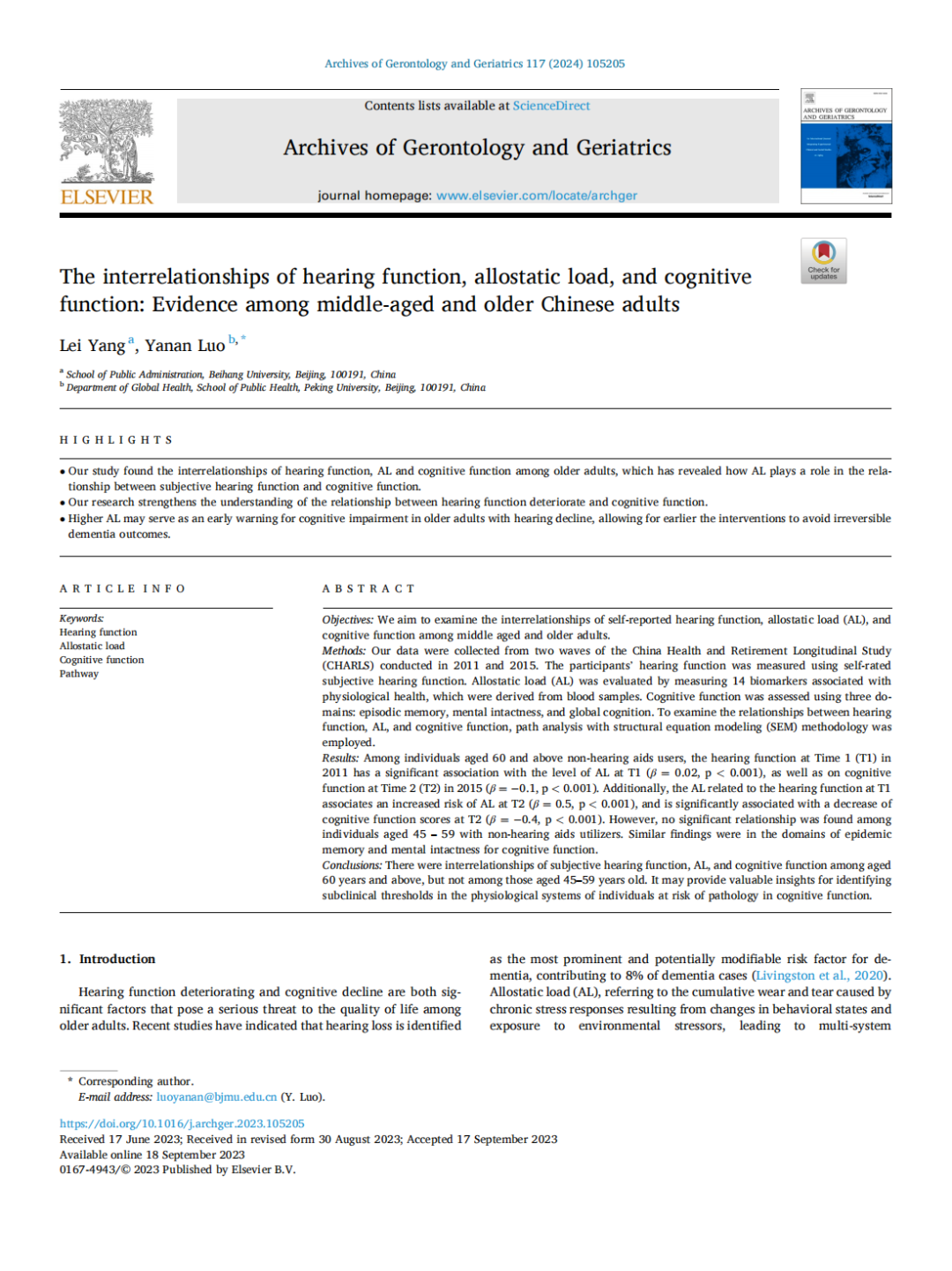 近日,北京欧美大片ppt免费大全人文社会科学学院(公共管理学院)杨磊副教授与北京大学公共卫生学院罗雅楠副研究员合作的文章《The interrelationships of hearing function,allostatic load,and cognitive function: Evidence among middle-aged and older Chinese adults》在SSCI期刊《Archives of Gerontology and Geriatrics》上发表,以下为文章全文。
