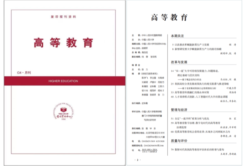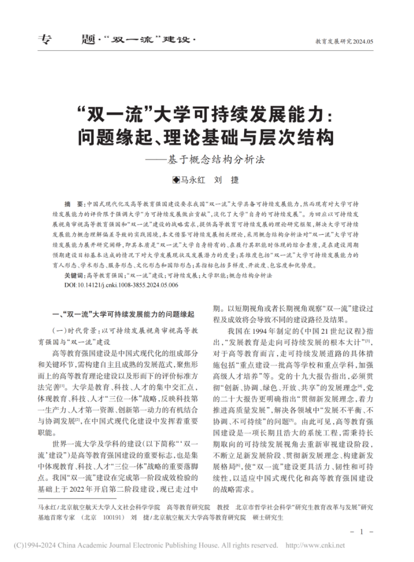 近日,北京欧美大片ppt免费大全人文社会科学学院(公共管理学院)马永红教授、硕士毕业生刘捷撰写的《“双一流”大学可持续发展能力:问题缘起、理论基础与层次结构——基于概念结构分析法》(原刊发于《教育发展研究》2024年第5期),被《人大复印报刊资料·高等教育》2024年第8期全文转载。以下为文章全文。