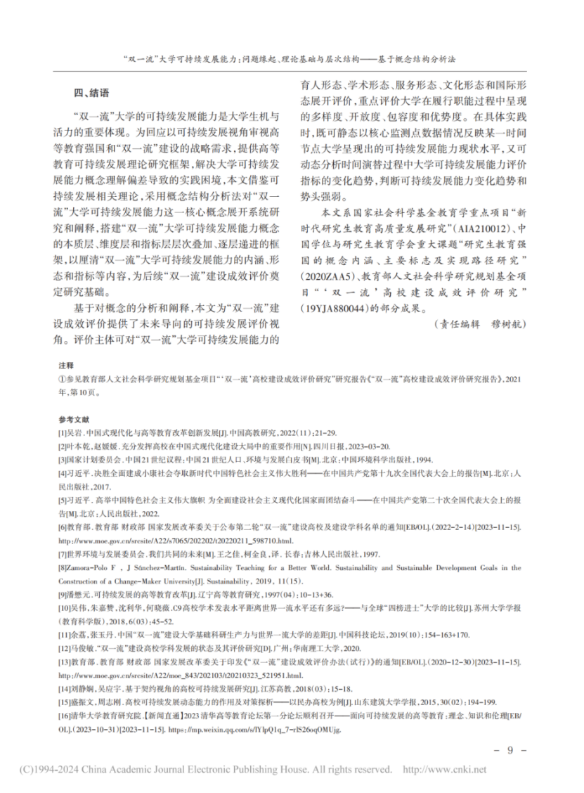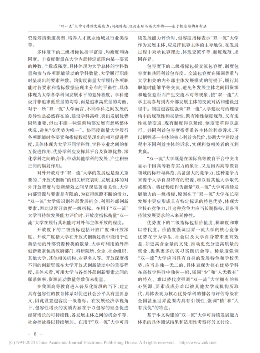 【摘要】中国式现代化及高等教育强国建设要求我国“双一流”大学具备可持续发展能力,然而现有对大学可持续发展能力的评价限于强调大学“为可持续发展做出贡献”,淡化了大学“自身的可持续发展”。为回应以可持续发展视角审视高等教育强国和“双一流”建设的战略需求,提供高等教育可持续发展的理论研究框架,解决大学可持续发展能力概念理解偏差导致的实践困境,本文借鉴可持续发展相关理论,采用概念结构分析法对“双一流”大学可持续发展能力展开研究阐释,即其本质是“双一流”大学自身特有的、在履行其职能时体现的综合素质,是在建设周期预期建设目标基本达成的情况下对大学发展现状及发展潜力的度量;其维度包括“双一流”大学可持续发展能力的育人形态、学术形态、服务形态、文化形态和国际形态;其指标包括多样度、开放度、包容度和优势度。