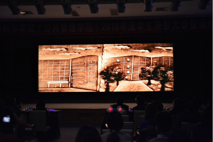 一涧飞瀑,碎琼乱玉,造就此景的不是水;一地竹影,摇曳生姿,造就此态的不是风。在严凰和辛卢娜同学空灵婉转的歌声中,沙画表演《人文的故事》在大屏幕上缓缓呈现。带我们一起回顾了学院创建和发展的历程,筚路蓝缕,以启山林;带我们重温了人文学子在学院学习和生活的日子,毓秀人文,砥砺前行。