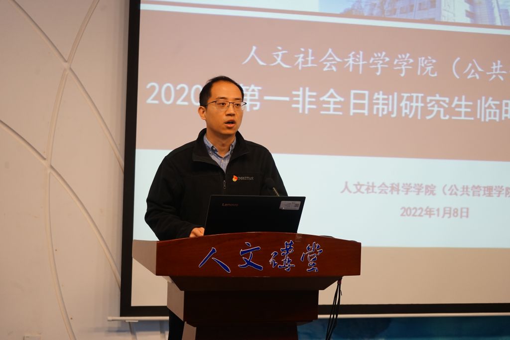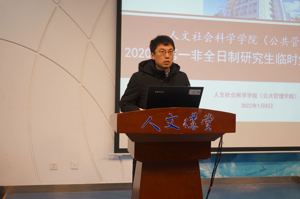 1月8日上午,人文公管学院2020级第一非全日制研究生临时党支部(以下简称“第一临时党支部”)成立大会在人文讲堂召开。院党委书记王琪全,党委研究生工作部副部长王扬,院党委副书记张驰,MPA班主任代表韩梦出席大会,会议由专职辅导员张同玉主持,2020级MPA非全日制研究生党员代表参加会议。