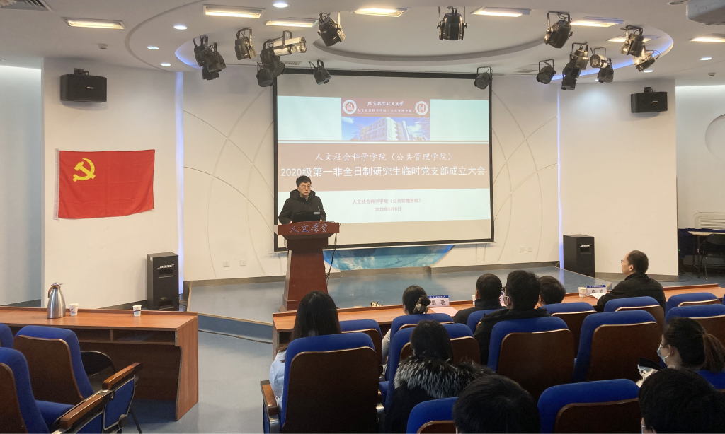 会议在庄严肃穆的《国际歌》中拉开序幕。首先王扬副部长对非全日制研究生临时党支部成立的背景、主要职责、未来目标和条件保障进行了详细介绍。他强调,成立临时党支部的工作目标在通过支部建设,发挥教育引领作用,提升同志们对北航的认同感,打造甘于奉献、高素质的党员队伍,传承爱国奉献、敢为人先、团结拼搏、担当实干的空天报国精神;发挥临时党支部战斗堡垒作用,提升组织的凝聚力,带动班风、学风和院风建设;发挥非全日制学生党员的行业资源优势,促进支部共建,实现学生群体的成长进步。