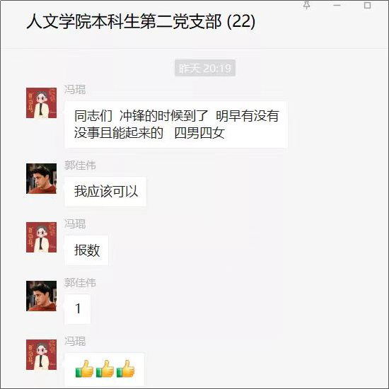 5月22日20:00,人文学院临时接到次日早上北航大运村首次供应早餐的任务,发布了志愿招募信息,需要志愿者们在次日早上(5月23日)配合大运村公寓盒饭服务,党员同志们积极报名,发挥先锋模范作用,“大运村售卖早餐”志愿者小分队15分钟内集结完毕。当日深夜,辅导员冯琨对次日志愿服务的时间点和工作内容进行了详细说明。