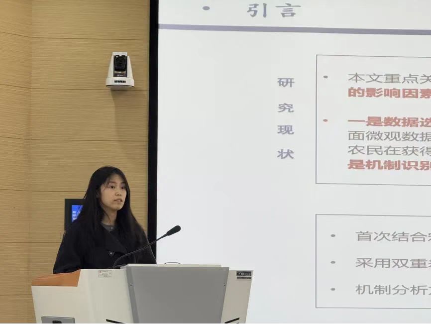周睿做题为《乡村振兴视域下农地抵押贷款对农民创业的影响研究》的学术分享。她聚焦于农地抵押贷款对农民创业的影响,首次结合宏观县域与微观家庭两个层面的创业数据,采用双重差分法进行政策效果识别,并进行了一系列稳健性实验,且在机制分析方面,首次详细探讨了制度信任对于农民创业行为的影响。研究发现,农地抵押贷款政策显著促进了农民创业,在该政策实施后,试点地区农民的创业发生率提高8.7%。农地抵押贷款不仅使农民敢于创业,而且能通过创业提高收入水平,实现共同富裕。由此提出加大政策宣传力度,进一步降低农地抵押贷款门槛与各地政府结合自身财力水平制定尽可能低的农地抵押贷款利率等政策建议。这项研究为乡村振兴战略提供了新的思路,也为政策优化提供了实证依据。