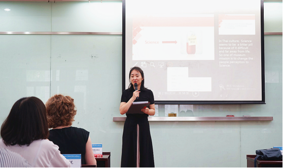 首先发言的是Umaporn Kruekamwang(乌玛朋·克鲁坎旺),她主要介绍了泰国国家科技馆在激发泰国国民学习科学积极性所发挥的教育作用,并以星空幻象为案例介绍互动科普教育展览项目在科普教育中的作用。