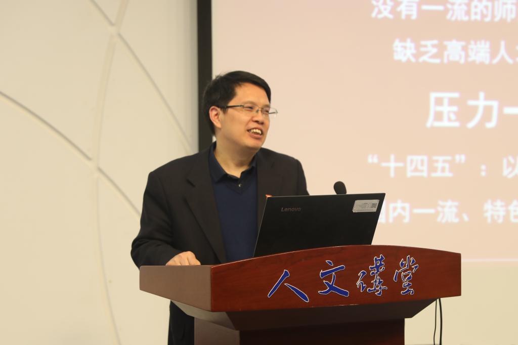 随后,蔡劲松院长从党建与战略谋划、学科和师资建设、人才培养、科研和学术交流、学生思政工作、管理服务和文化建设等方面,系统讲解和部署今年学院的重点工作任务。他指出,学院在“十三五”时期得了突出的成绩,但也面临着许多问题和不足。“不进则退、慢进则衰”,全院师生必须牢牢把握“十四五”开局这一重大机遇期,紧紧围绕国家治理体系与治理能力现代化主线,主动融入国家战略,主动服务区域经济社会发展重大需求,以改革创新精神做好“十四五”规划编制和2021年各项重点工作,凝心聚力、坚定信念,扎实工作、开拓进取,促进学科建设、人才培养、师资队伍、科学研究、党建文化等各个方面迈上新台阶,着力推进实现学院新的历史性跨越。